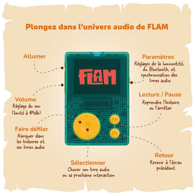 Avec un design qui favorise l’immersion (l’écran étant éteint pendant l’écoute), FLAM stimule l’attention et la réflexion des jeunes utilisateurs. Il propose une variété de contenus adaptés à leur âge, englobant des genres comme l’aventure et la fantasy, tout en développant leur imagination, créativité, concentration et autonomie.