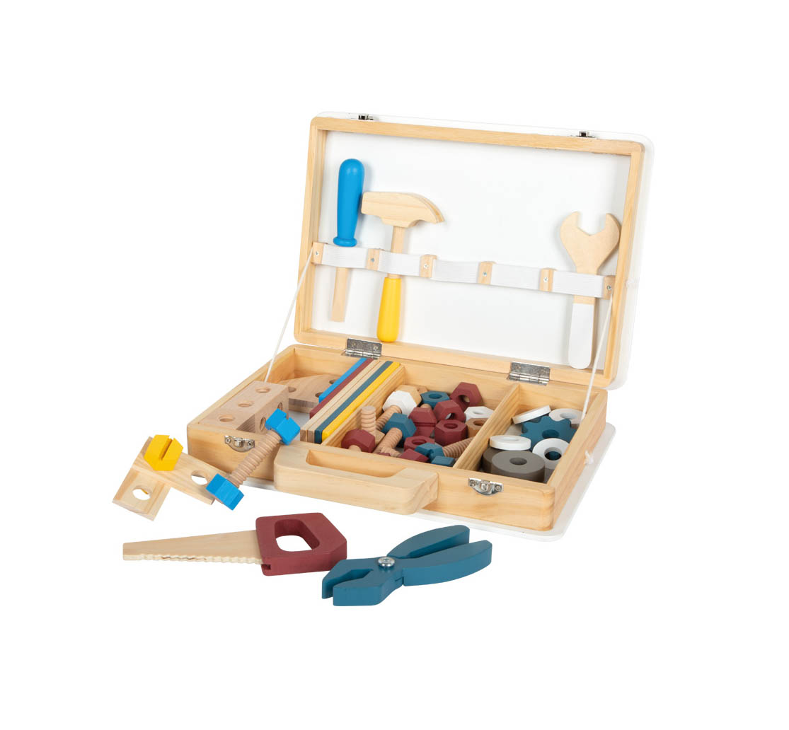 Coffre à outils pratique pour enfants avec fermeture à clip et poignée de transport en bois avec 1 mallette, 1 marteau, 1 clé à molette, 1 tournevis, 1 pince, 1 scie, 11 vis, 12 écrous, 2 baguettes à trous carrées, 2 petites barres à trous, 4 barres à trous moyennes, 4 grandes barres à trous, 2 barres à trous en forme de diamant, 4 écrous épais, 4 écrous fins, 2 roues dentées