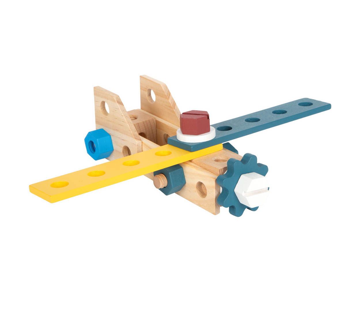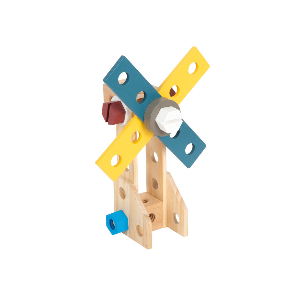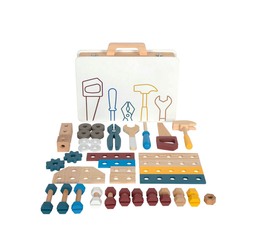 On craque sur cette superbe mallette à outils pratique pour enfants en bois ! Avec plus de 5 outils en bois (marteau, clé à molette, tournevis, pince et scie) et de nombreux accessoires tels que des vis, des écrous, des roues dentées ainsi que des vis de différentes formes et tailles, votre enfant pourra à l’aide des instructions fournies, construire une voiture de course, un hélicoptère, un moulin à vent et même un avion ! Parfait pour jouer au bricoleurs !