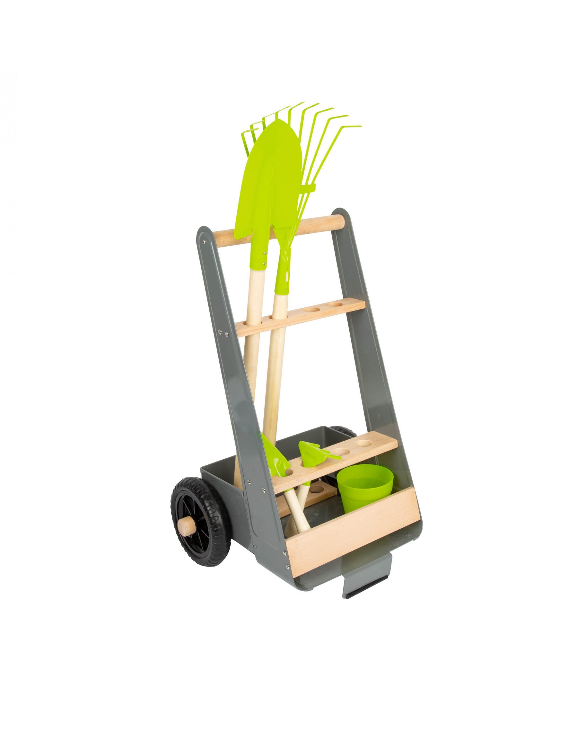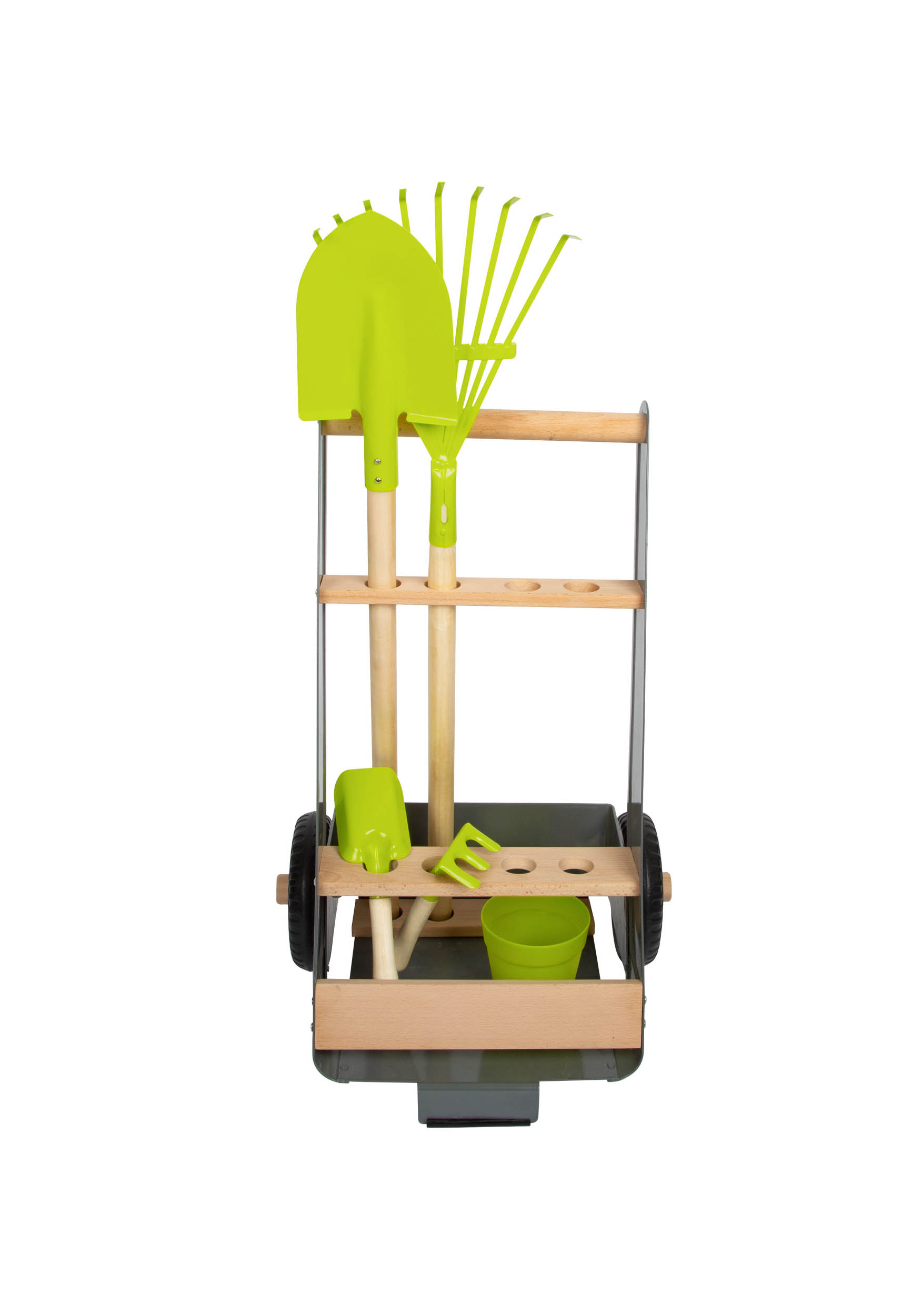 Ce set complet comprend une bêche, un balai à feuilles, un pot à plantes, une pelle et un râteau, parfaitement adaptés aux petites mains. Solide et maniable grâce à ses roues pratiques, le chariot dispose de nombreux rangements pour transporter et organiser tous les outils, même ceux que votre petit jardinier ajoutera plus tard !