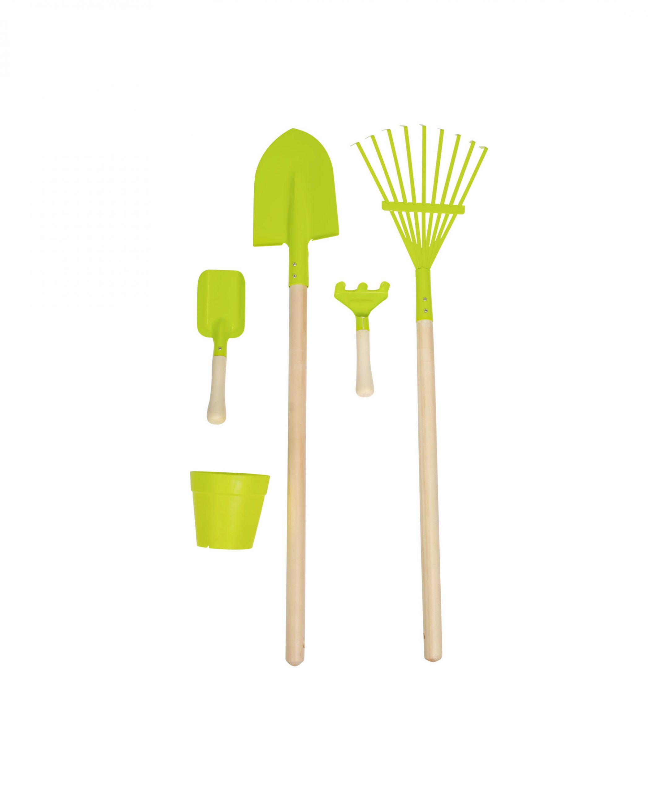 De 3 à 8 ans. Le kit comprend un chariot de rangement en bois, une bêche, un balai à feuilles, un pot à plantes en plastique et deux petits outils de jardin (pelle et râteau).