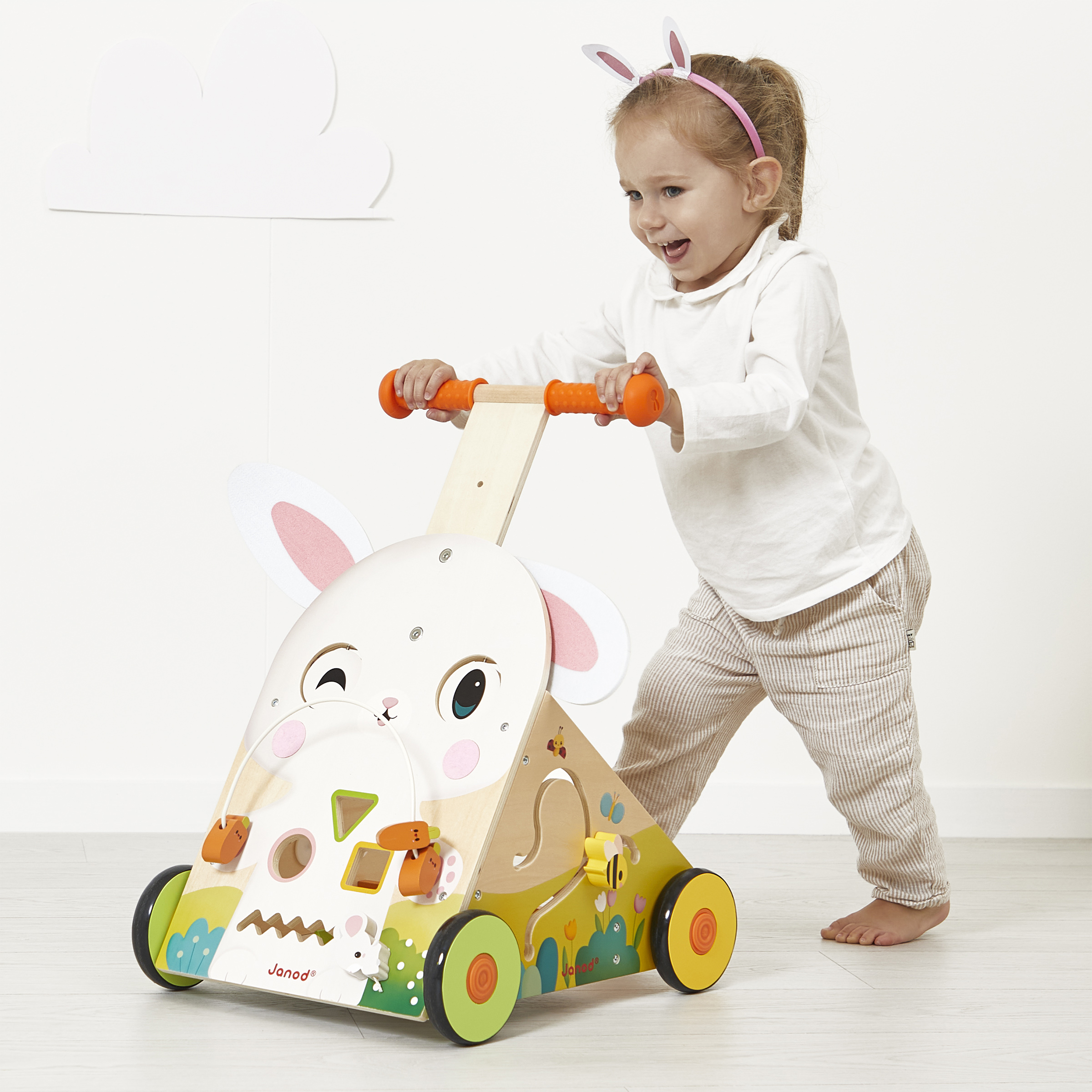 Faites place au plus mignon des compagnons : notre lapinou blanc aux grands yeux accompagne bébé dès 12 mois dans ses premiers pas et ses découvertes. Ce chariot multi-activités en bois propose 9 jeux ludiques sur 3 faces pour développer la motricité, la dextérité et la coordination : circuit looping avec carottes, boîte à formes, petite souris dans un labyrinthe, labyrinthe abeille, engrenages et soleil sonore. Les yeux rotatifs, les joues et les oreilles en feutrine stimulent le toucher, et les oreilles sont amovibles grâce à des attaches scratch pour encore plus de fun !