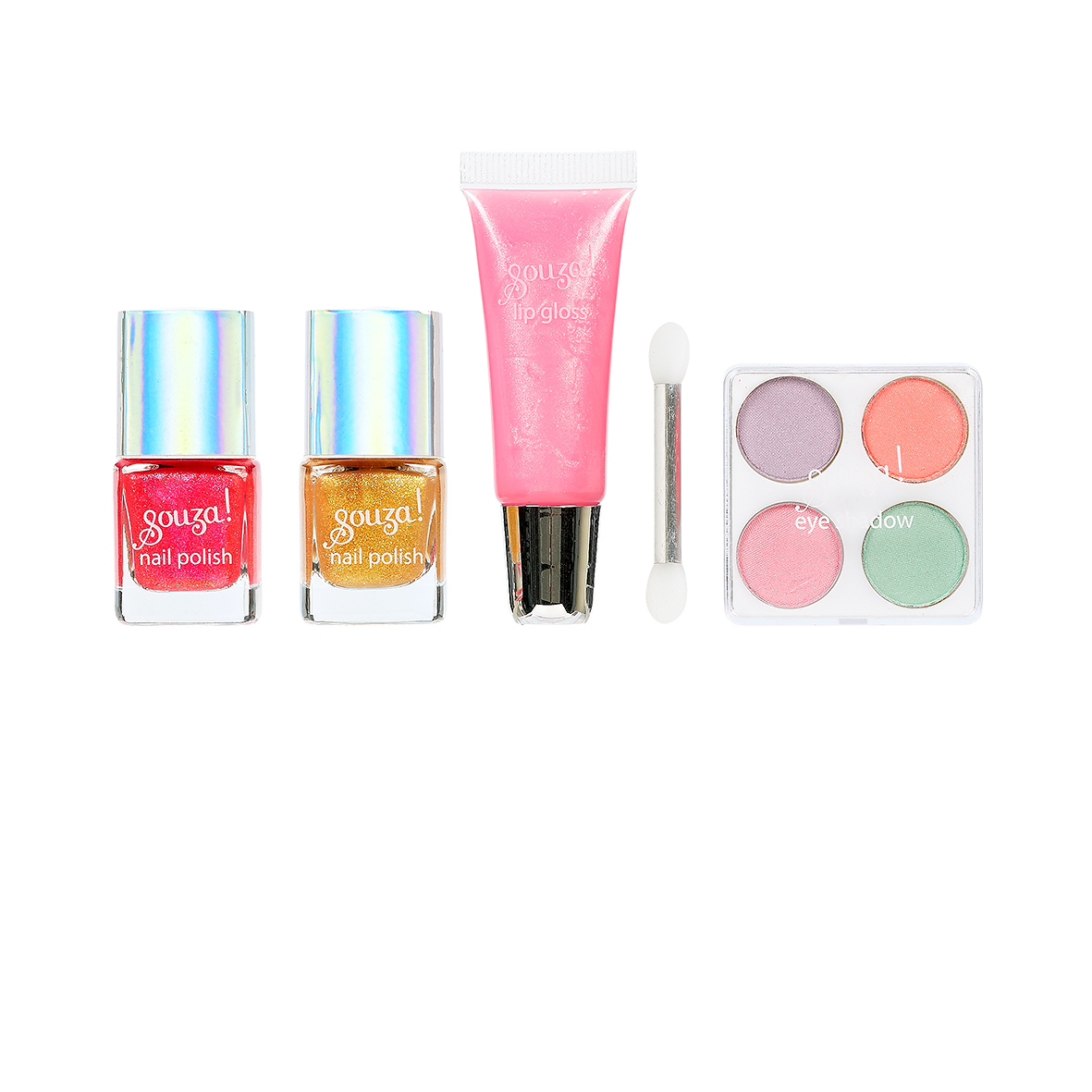 Avec deux couleurs différentes de vernis à ongles, un brillant à lèvres et une palette de 4 fard à paupières ainsi qu’un pinceau de maquillage.
