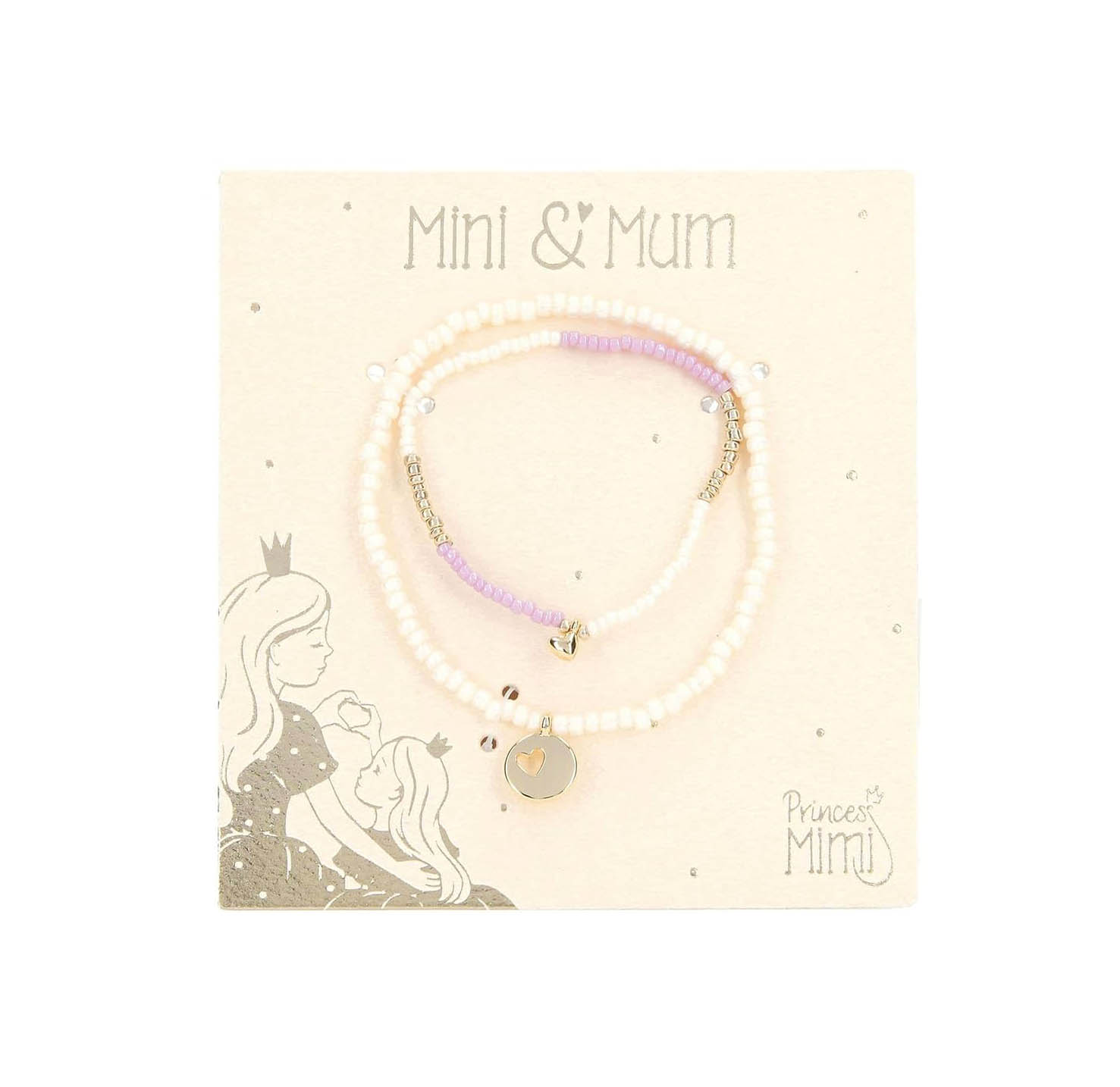2 magnifiques bracelets pour maman et fille par Princess Mimi. Le bracelet de maman a des perles blanches et un pendentif en forme de plaque dorée avec découpe en cœur. Le bracelet pour enfant est composé de perles blanches, roses et dorées et d’un pendentif en forme de cœur doré. Un ensemble pour deux qui sont ensemble.