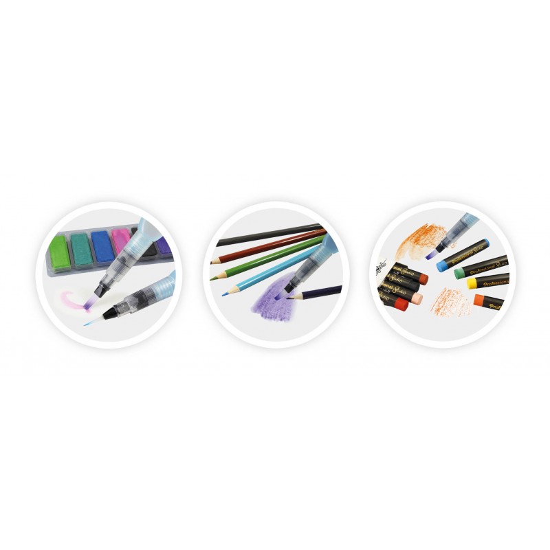 À partir de 6 ans. Inclus 1 trousse avec poignée, 1 bloc à dessin 35 feuilles -300g, 2 pinceaux à réservoir d’eau, 12 pastilles de peinture, 8 pastels à l’huile, 24 feutres double-embout, 18 crayons aquarellables, 12 stylos gel, 2 crayons de papier, 1 gomme, 1 règle, 1 taille crayon et 1 notice en couleurs.