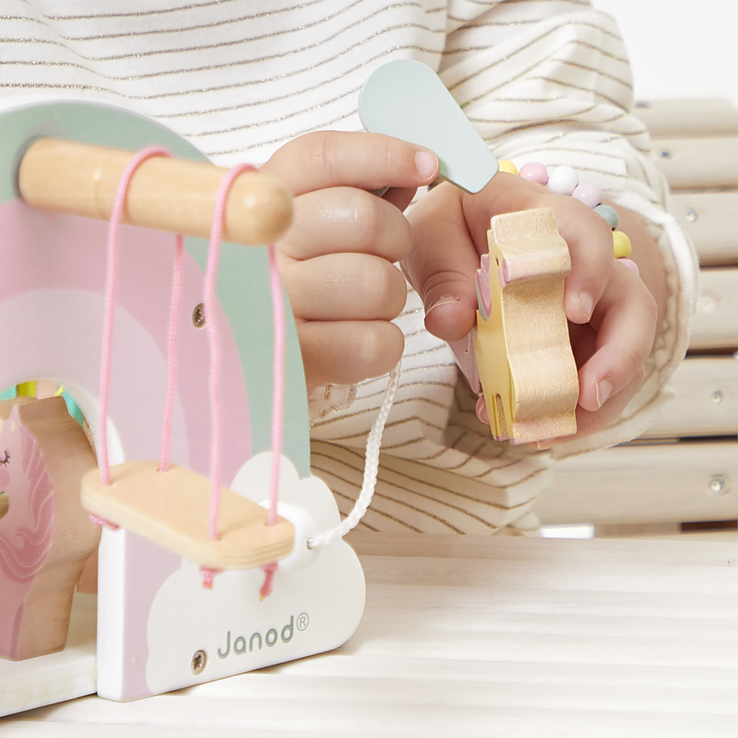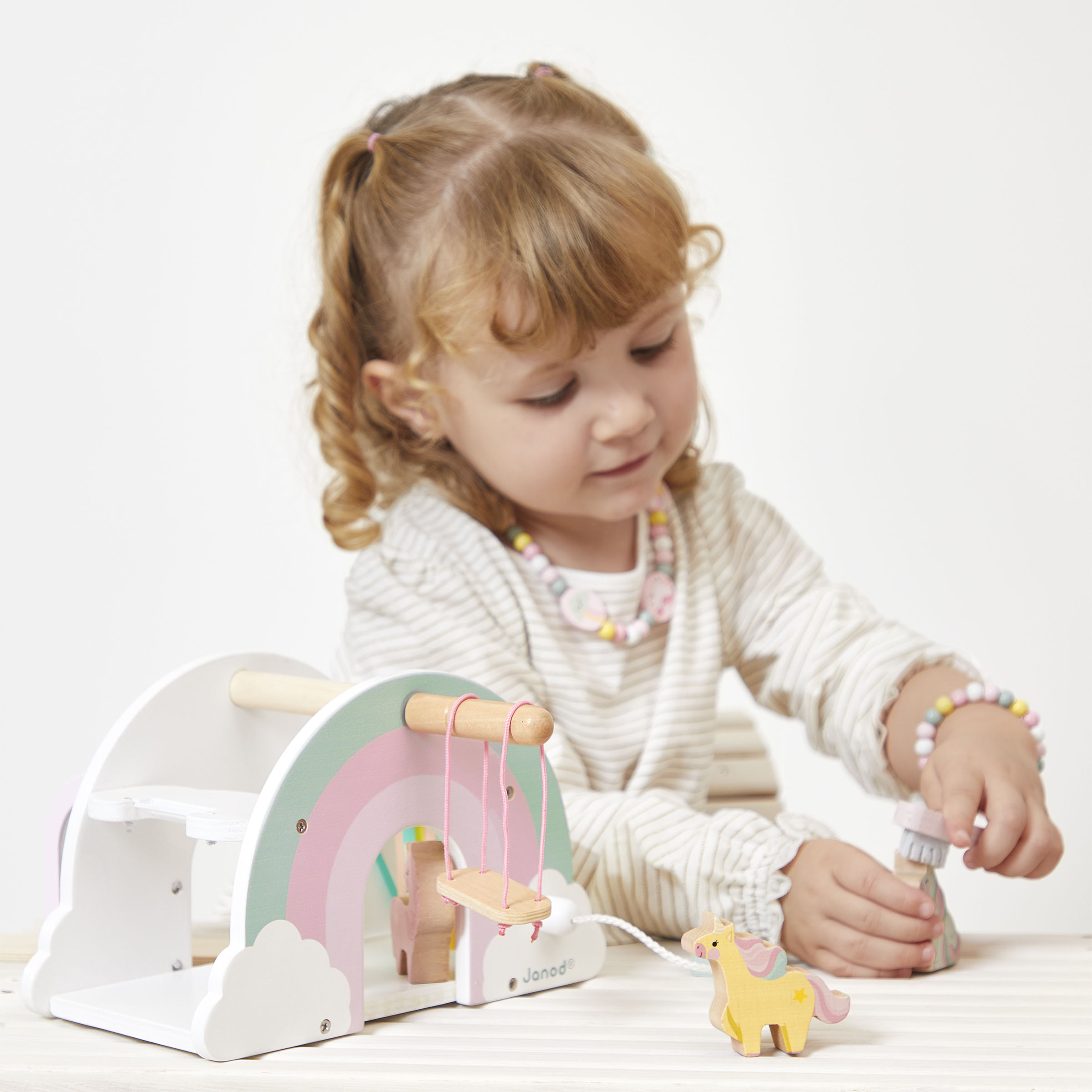 Conçue en bois et décorée aux couleurs de l’arc-en-ciel, cette charmante maison de jeu offre un cadre féerique pour des heures d’imagination. Livrée avec 4 figurines licornes et des accessoires comme une brosse et un sèche-cheveux, elle invite les enfants à prendre soin de leurs compagnons enchantés. Les licornes glissent sur le toboggan, se balancent sur la balançoire ou explorent la porte miroir secrète et la cascade de franges colorées. Chaque détail encourage les enfants à inventer des histoires et à développer leur motricité en s’amusant.