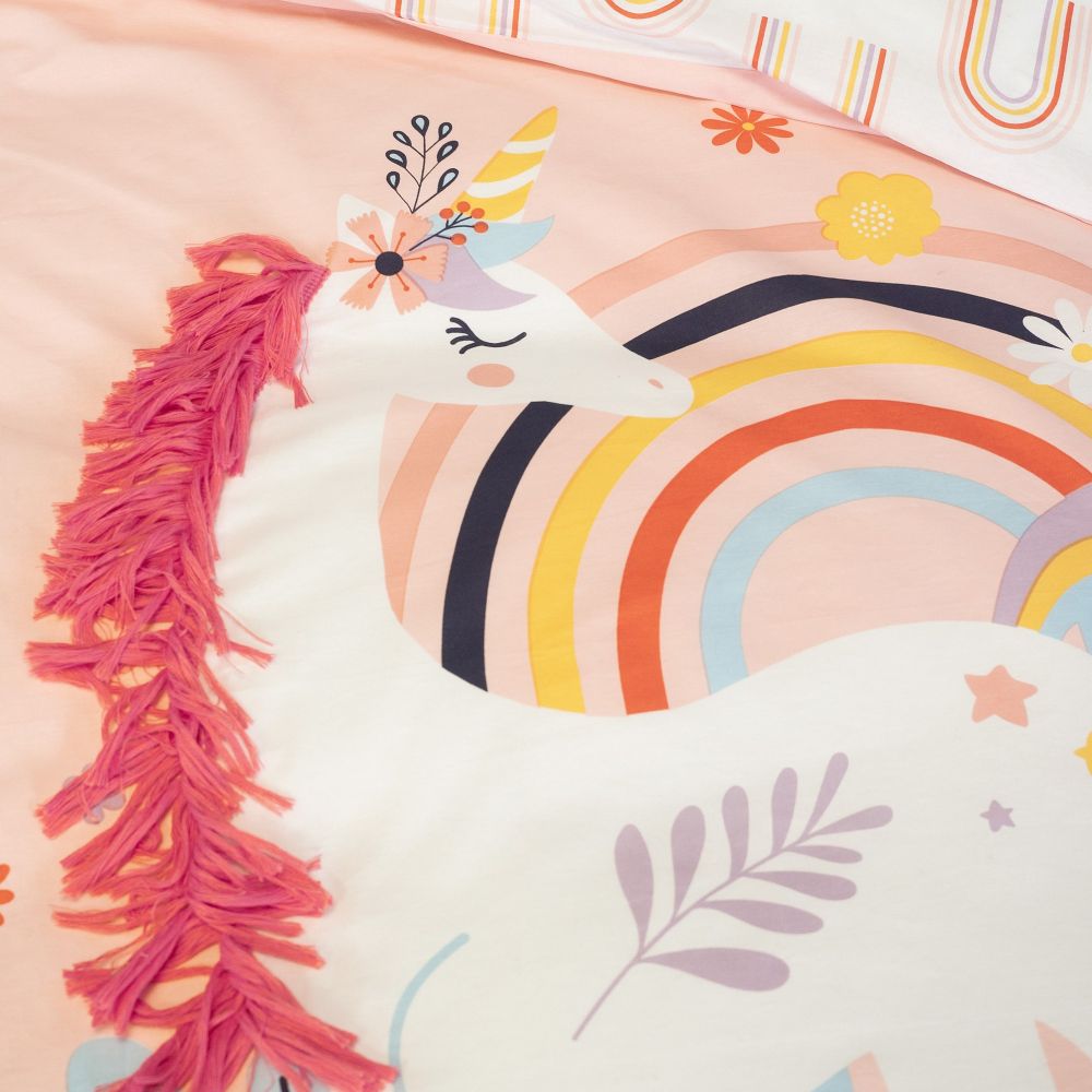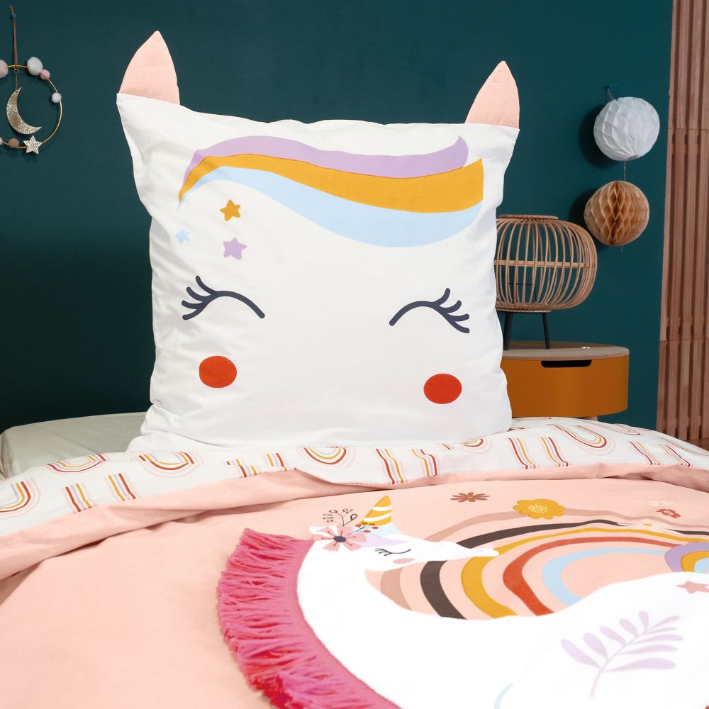 Apportez une touche de douceur et de couleur dans la chambre de votre petite fille avec cette jolie parure de lit housse de couette et taie d’oreiller sur le thème féerique des licornes  !