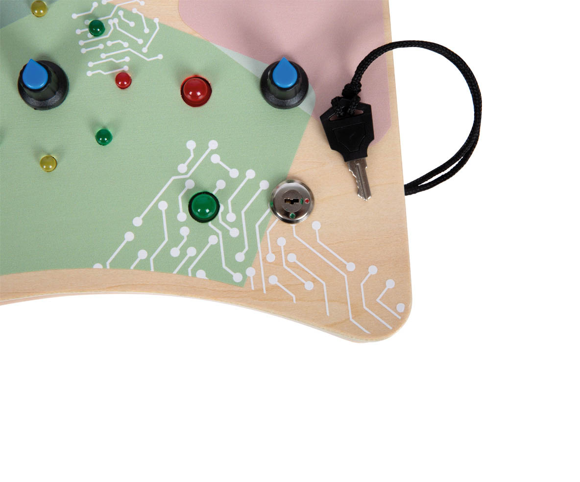 Ce jouet éducatif en bois est idéal pour stimuler la curiosité et la motricité, avec ses boutons, ses interrupteurs rotatifs et à bascule et sa clé de contact, il permettra de développer la motricité fine et la coordination œil-main.