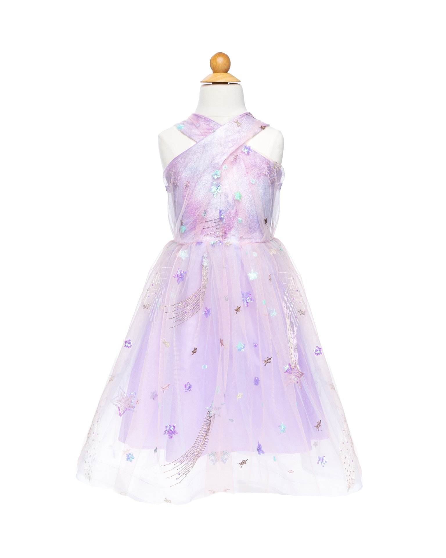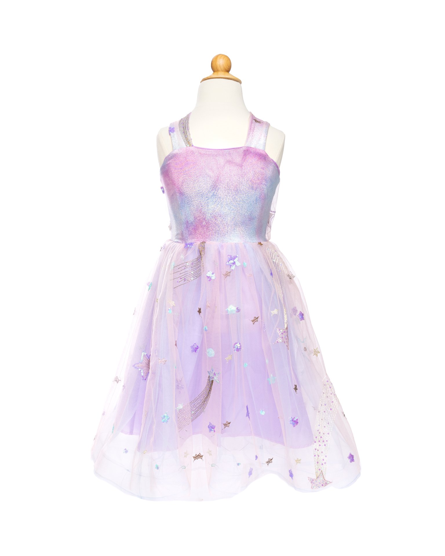 Ornée d’une constellation d’étoiles, cette robe ajoute une touche de charme céleste à toute occasion. La teinte lilas apporte une touche douce et élégante, tandis que le haut à bretelles croisées ajoute un élément ludique et élégant. Qu’il s’agisse d’un jeu pour s’amuser et se déguiser, d’un concert dans le salon pour la famille ou d’une célébration spéciale, cette robe est le choix parfait pour les moments de joie et de fantaisie et deviendra vite le vêtement incontournable préféré de votre enfant !
