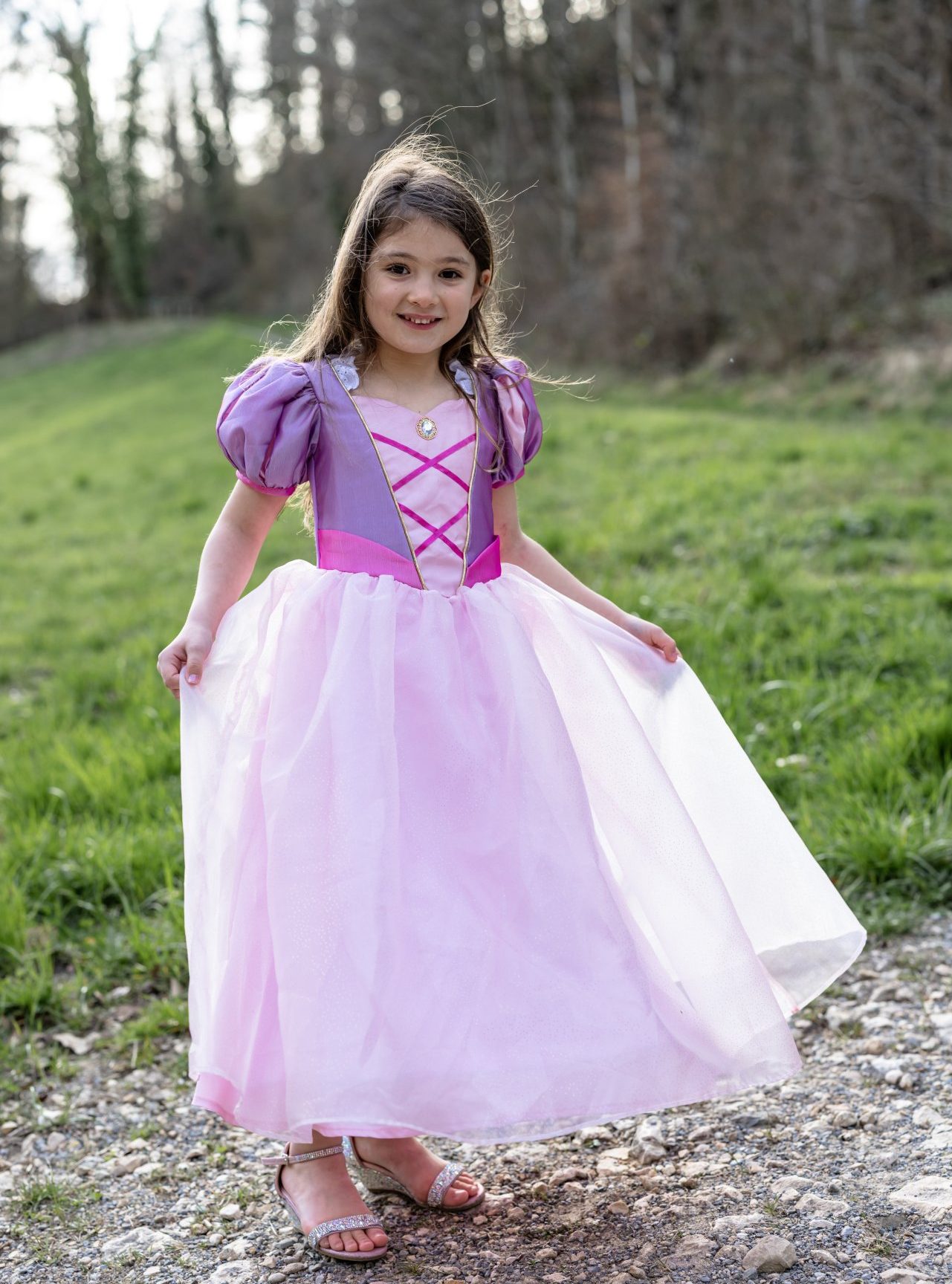 Laissez tomber vos cheveux et la magie commencer avec cette superbe robe de princesse ! Avec de charmants détails en ruban rose entrecroisé sur le devant, capturant le look de conte de fées, cette robe est parfait pour tourner à travers les jardins, les châteaux ou les aventures imaginaires. Les manches bouffantes ajoutent une touche de princesse classique, tandis qu’un délicat col blanc à volants se lève de l’encolure, donne à la robe une finition royale.