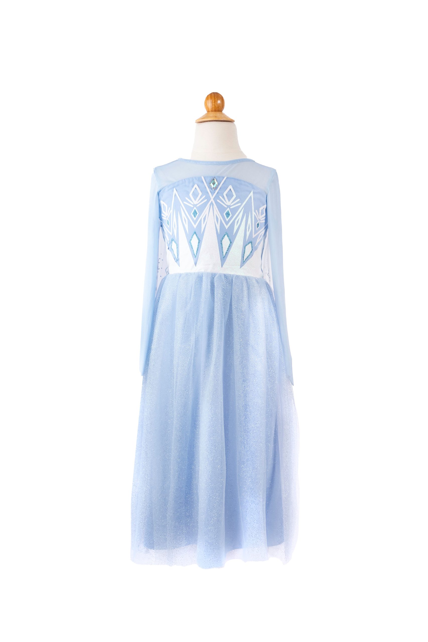 Le corsage bleu présente de délicats détails blancs et bleus inspirés du flocon de neige et les manches en maille bleue douce correspondant parfaitement à la cape fluide qui se drape derrière. La cape est ornée de détails bleu glacé et blanc qui flottent à chaque pas, faisant de cette robe une véritable merveille d’hiver !