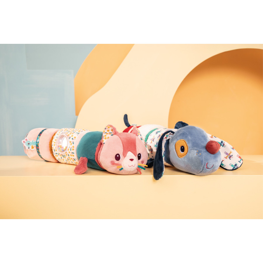 Ce jouet d’éveil se compose de 4 cylindres en peluche à assembler et démonter grâce à des scratchs. Chaque rouleau propose un son différent, des matières variées et des motifs attrayants, favorisant l’éveil des sens, la motricité et la réflexion.