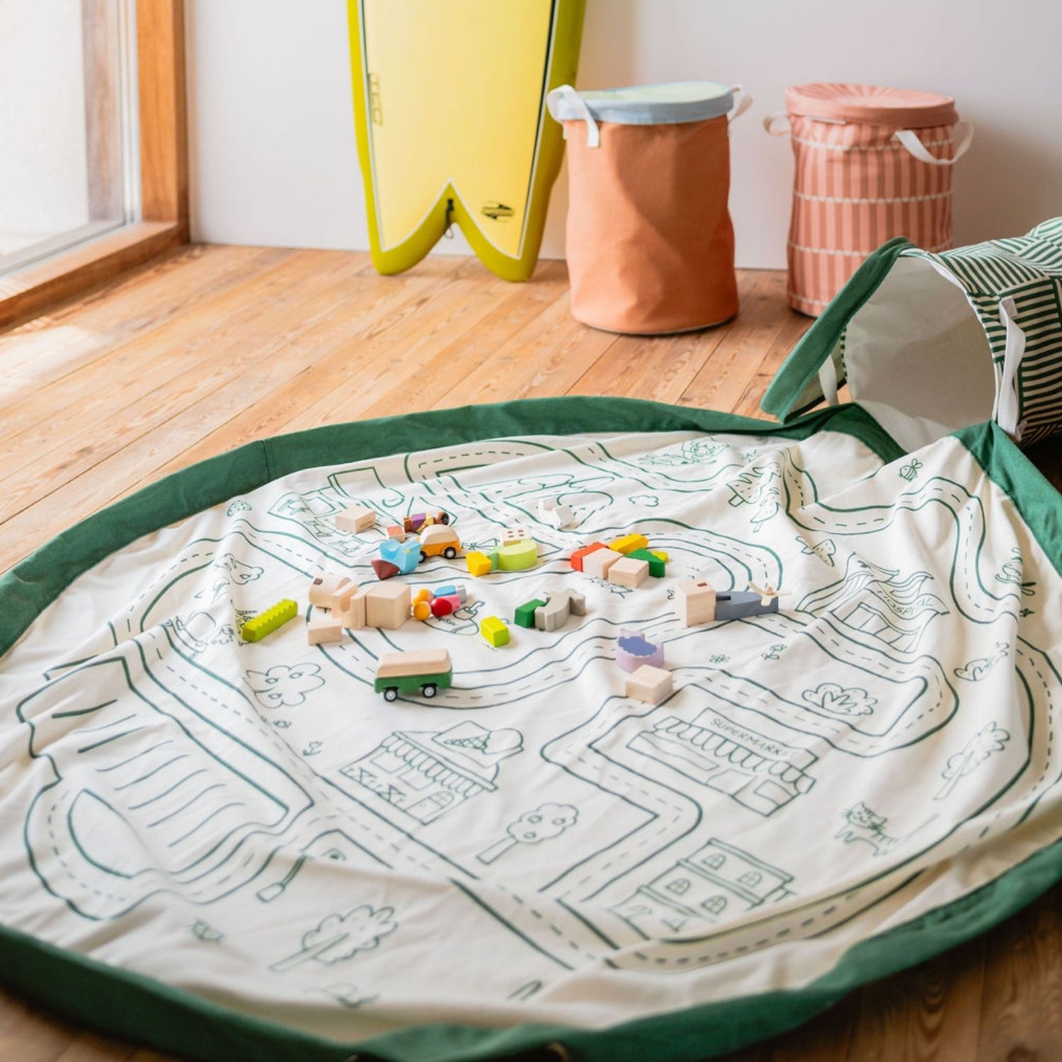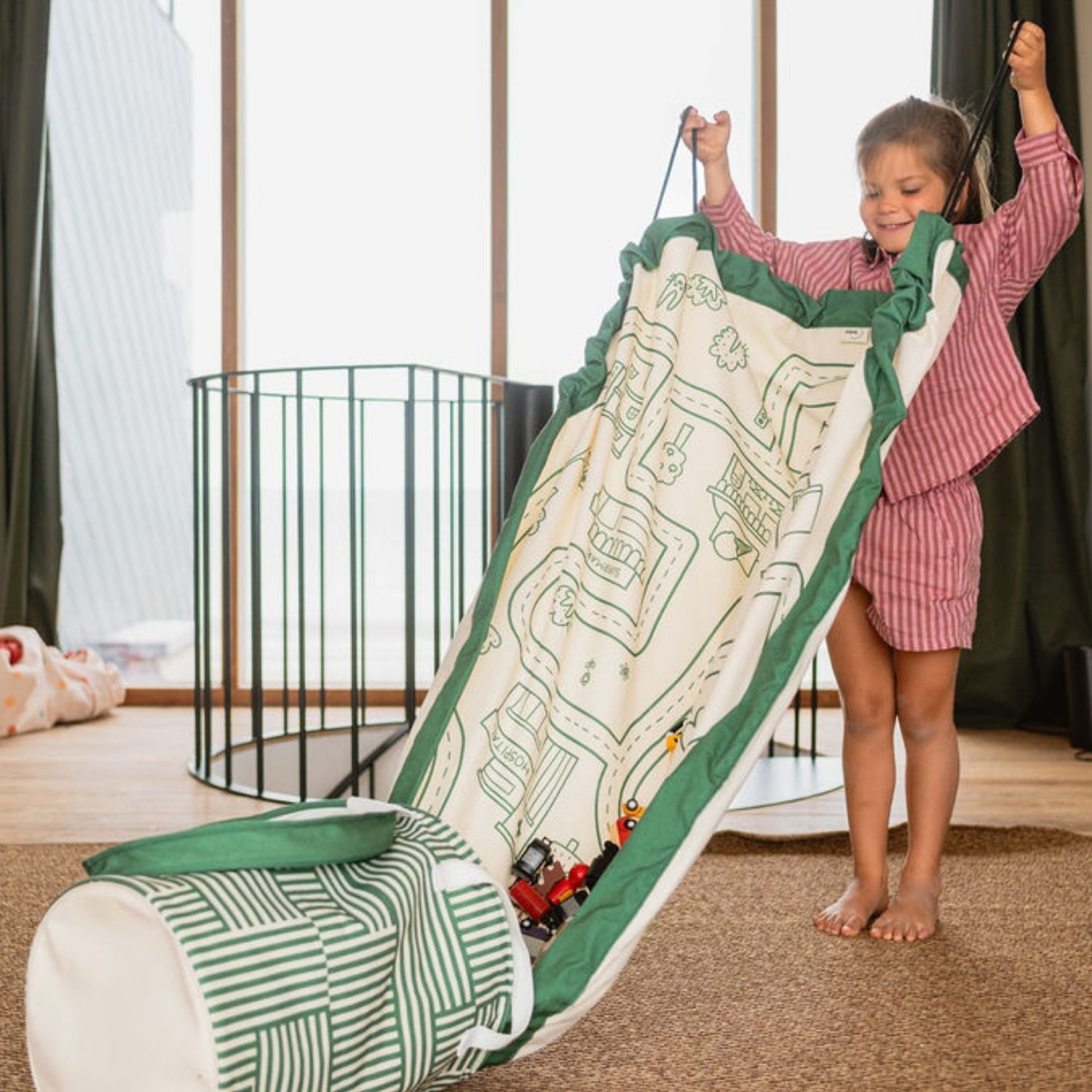 Déplié, il offre un grand espace de jeu illustré d’un circuit routier parfait pour stimuler l’imagination et les aventures en petites voitures. En un seul geste, il se transforme en panier de rangement pratique grâce à son système de cordons, permettant de ranger tous les jouets en quelques secondes.
