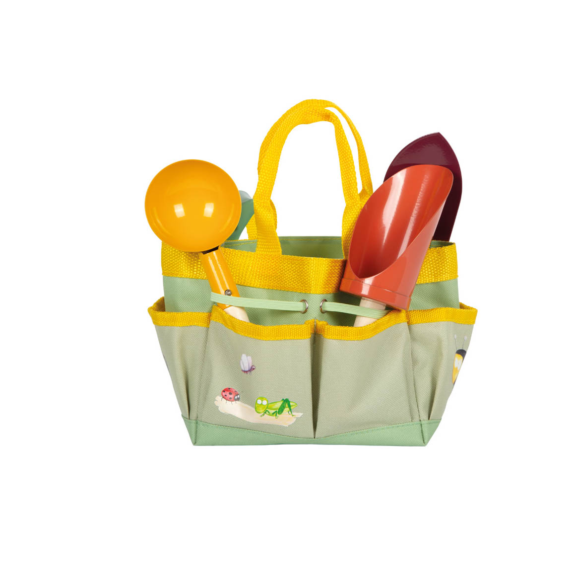 Tu as tous ce qu’il te faut pour jardiner quand tu as envie, ou même aider maman et papa avec ton kit de 5 outils pour le jardin et son sac de transport. Voilà un bel ensemble de jardinage pour jouer dehors !