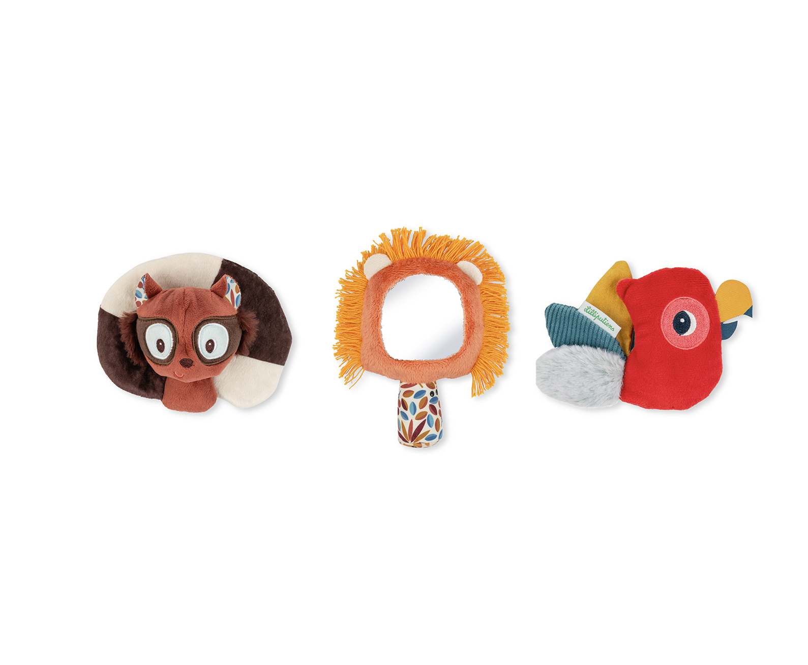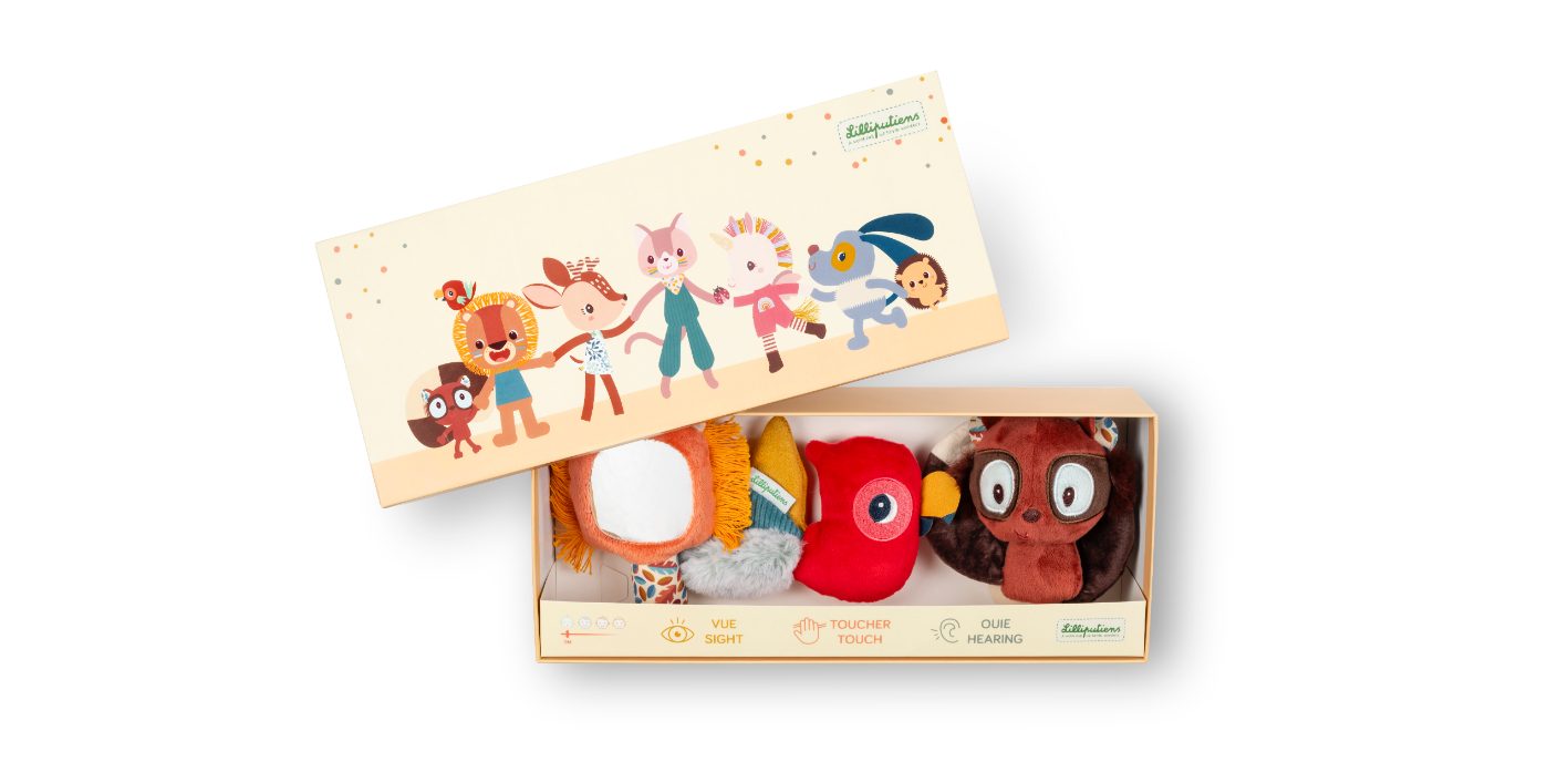 Offrez à bébé ses premiers jouets d’éveil avec ce joli coffret de 3 hochets sensoriels Lilliputiens, adaptés dès la naissance. Doux, colorés et faciles à attraper, ils stimulent la vue, le toucher et l’ouïe : Elvis le lémurien produit un bruissement amusant, Jack le lion cache un petit miroir dans sa crinière, et Gilles le perroquet propose plusieurs textures à explorer du bout des doigts. Présentés dans un coffret illustré, ces hochets en tissu sont parfaits pour éveiller bébé en douceur. Une belle idée cadeau dès la naissance !