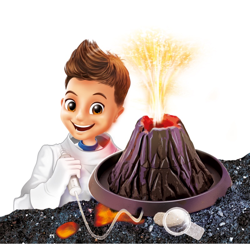 À partir de 8 ans. Inclus 1 seringue, 1 tube en plastique, bicarbonate de soude, acide citrique, colorant rouge, 1 connecteur, 1 volcan, 3 roches (pierre ponce, granite et basalte), 1 loupe, 1 carte, 1 transparent volcans et 1 transparent dinosaures, 6 cartes Volcans, 1 carte du Volcan Labyrinthe, 1 carte Ombres chinoises, 1 carte Portraits de dinosaures, 3 pailles, 1 longue capsule, 1 gobelet, 1 récipient avec bouchon, 2 petits dinosaures, 1 bloc de plâtre, 1 outil de fouille et un 1 pinceau, 1 ficelle, 1 livret d’avertissement, notice illustrée en couleurs.